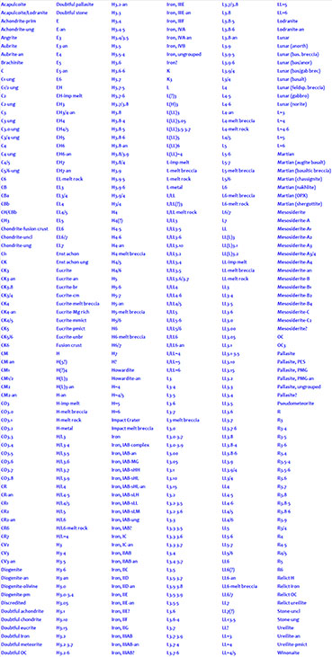 Questa tabella riporta le circa 480 differenti classificazioni delle meteoriti ad oggi ufficialmente riconosciute a livello internazionale.