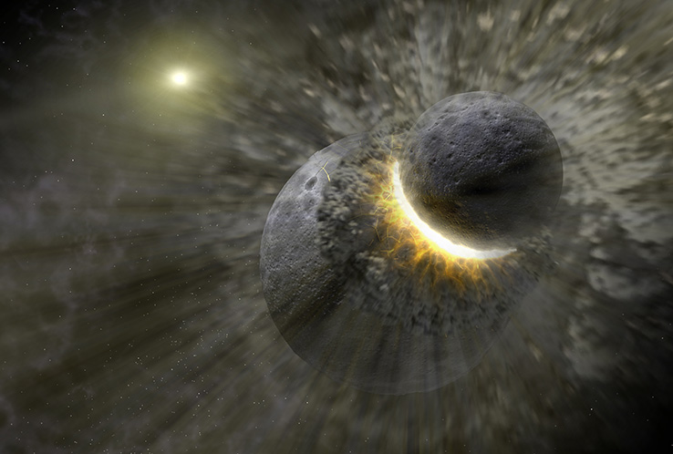 Questa rappresentazione artistica ci aiuta ad immaginare come potrebbe avvenire la collisione fra due grossi corpi celesti. Si ritiene che nelle prime fasi evolutive del Sistema Solare questi scontri fossero molto frequenti.