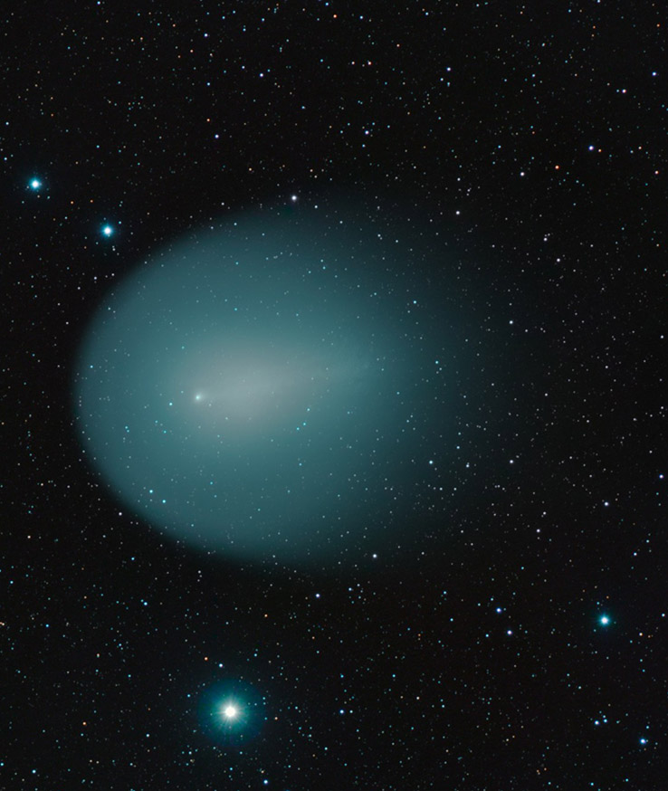 La cometa 17P/Holmes, in questo caso la chioma cometaria era particolarmente evidente, nella fotografia appare come una struttura verdastra vagamente sferica che si sviluppa tutt’attorno al nucleo.
