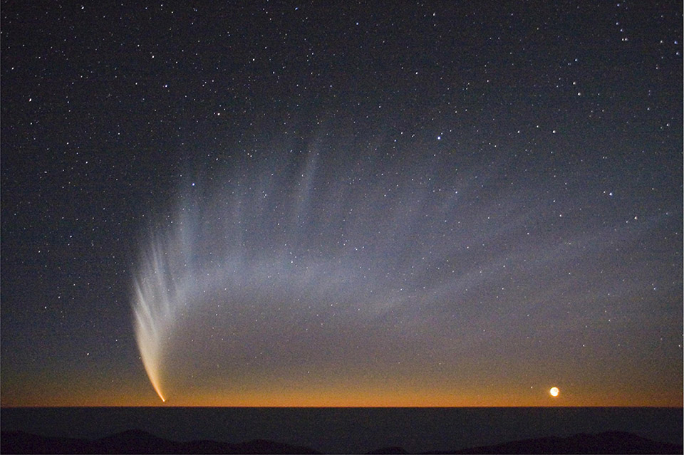 Cometa C/2006 P1 McNaught: la più luminosa cometa degli ultimi 40anni. Per gli abitanti dell’emisfero australe era perfettamente visibile anche ad occhio nudo all’imbrunire. La coda estremamente vasta copriva buona parte del cielo. In basso a destra nell’immagine è ripresa anche la Luna, che può essere utilizzata come utile confronto per rendersi conto delle imponenti dimensioni apparenti della cometa.