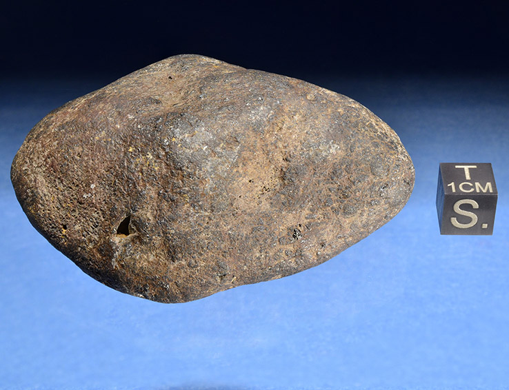 Questa pietra è quanto di più simile ad una meteorite io abbia mai visto. Presenta un'elevatissima densità, un aspetto metallico sia al tatto che alla vista, sembra pure arrugginita ed è addirittura molto magnetica! Tuttavia si tratta di un comune nodulo di ematite (ossido di ferro) raccolto in un fiume, è stato arrotondato e levigato dal flusso dell'acqua. La presenza di quello strano foro e di una minuta struttura cristallina consentono di capire che la sua origine è assolutamente terrestre.