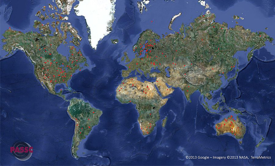 I pallini rossi su questa mappa mostrano i crateri ad oggi conosciuti sulla superficie terrestre.