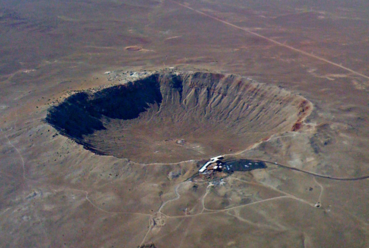 Questa fotografia ritrae il famoso Meteor Crater in Arizona. È uno dei crateri meglio conservati su tutta la superficie terrestre. Ha un diametro di circa 1200 metri ed una profondità massima di 170 metri. Si stima che l’impatto avvenne circa 50 mila anni fa. Secondo le più recenti teorie l’oggetto che impattò contro il suolo doveva avere un dimensione di circa 50 metri, una velocità 13 km/s (46000 km/h) ed una massa approssimativa di 300 mila tonnellate. Parecchie meteoriti ferrose vengono ancora oggi trovate nelle zone attorno al cratere.