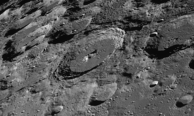 Questa fotografia ci dà una chiara idea di come appaia la superficie lunare. Vediamo una gran quantità di crateri semplici, con la tipica forma a scodella. Il cratere di dimensione maggiore nel centro dell’immagine, presenta anche il caratteristico picco centrale, dovuto al "rimbalzo" della roccia in seguito al violentissimo impatto. Il suo diametro è stato calcolato in 114 km, mentre la sua profondità è di circa 5 km.