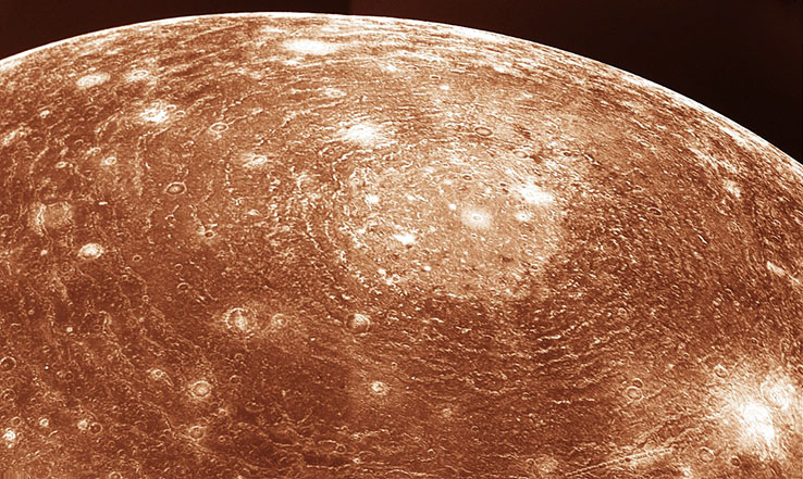 Questa immagine mostra il cratere Valhalla, il più grande del Sistema Solare, scoperto dalle sonde Voyager su Callisto, una luna di Giove. Tutt’attorno al cratere centrale, del diametro di 360 km, si sviluppa un intricato sistema di anelli concentrici che si estende per oltre 3800 km.